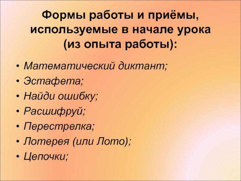 Слайд 5Формы работы и приёмы, используемые в начале урока
