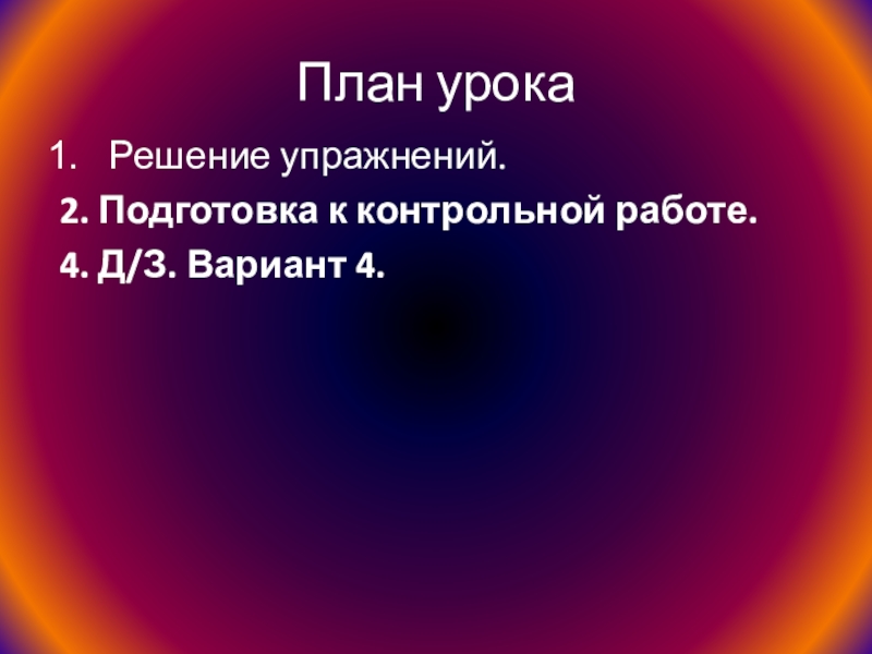План урокаРешение упражнений.2. Подготовка к контрольной работе.4. Д/З. Вариант 4.