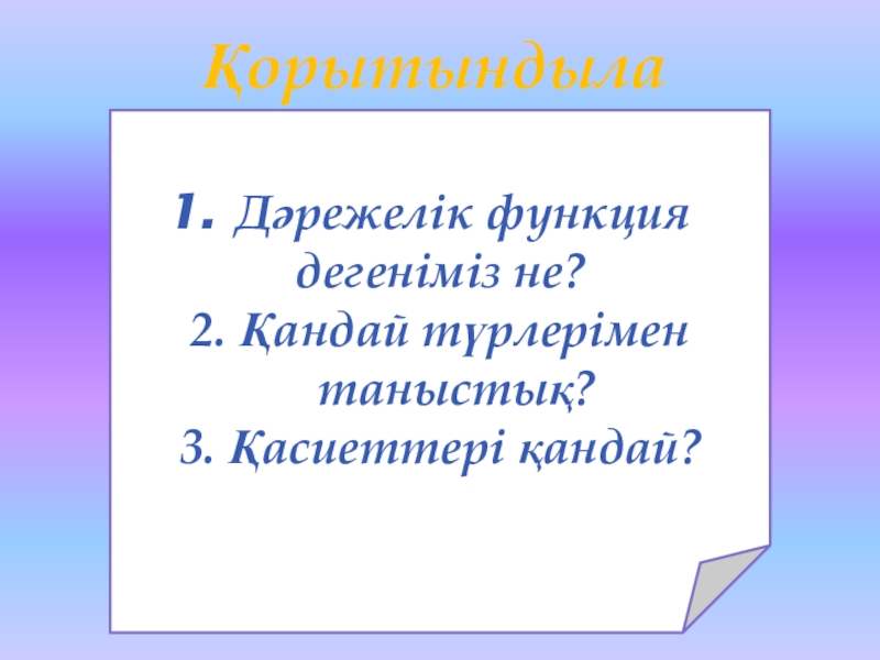 Қорытындылау Дәрежелік функция дегеніміз не?2. Қандай түрлерімен таныстық?3. Қасиеттері қандай?