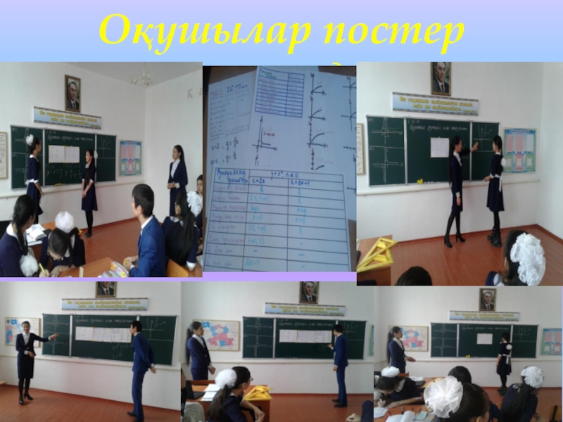 Слайд 8Оқушылар постер қорғауда