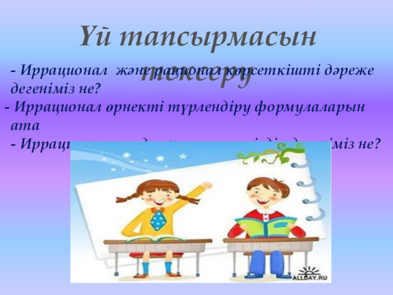 Үй тапсырмасын тексеру- Иррационал және рационал көрсеткішті дәреже