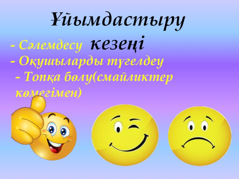 Ұйымдастыру кезеңі Сәлемдесу Оқушыларды түгелдеу- Топқа бөлу(смайликтер көмегімен)