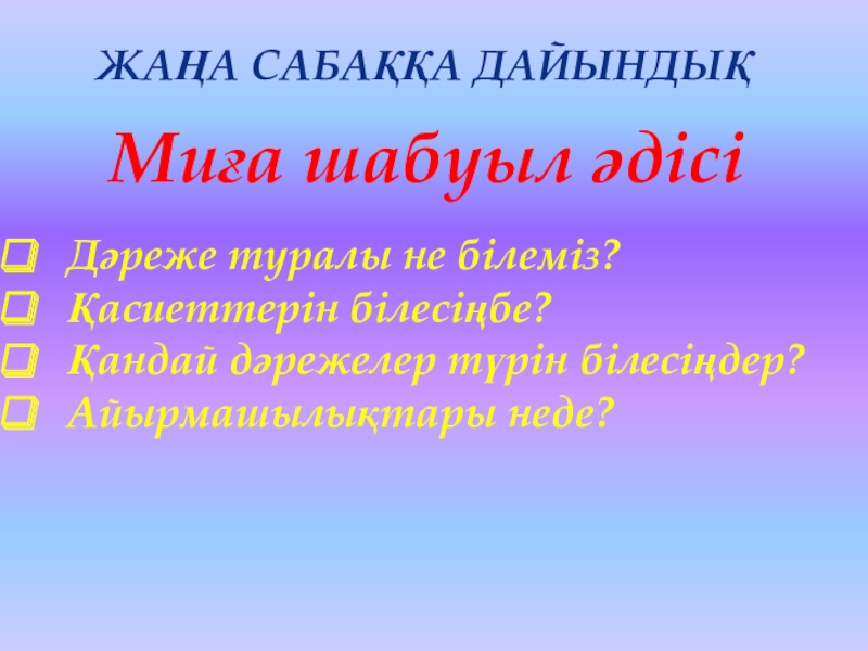 Жаңа сабаққа дайындықМиға шабуыл әдісі  Дәреже туралы не білеміз?  Қасиеттерін білесіңбе?  Қандай дәрежелер түрін