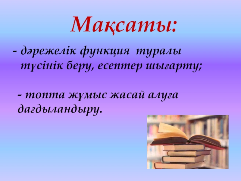 Мақсаты: дәрежелік функция туралы түсінік беру, есептер шығарту;- топта жұмыс жасай алуға дағдыландыру.