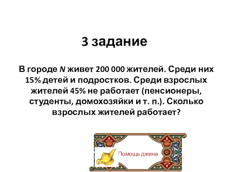 Помощь джина3 заданиеВ городе N живет 200 000 жителей. Среди них 15% детей и подростков. Среди взрослых жителей 45% не