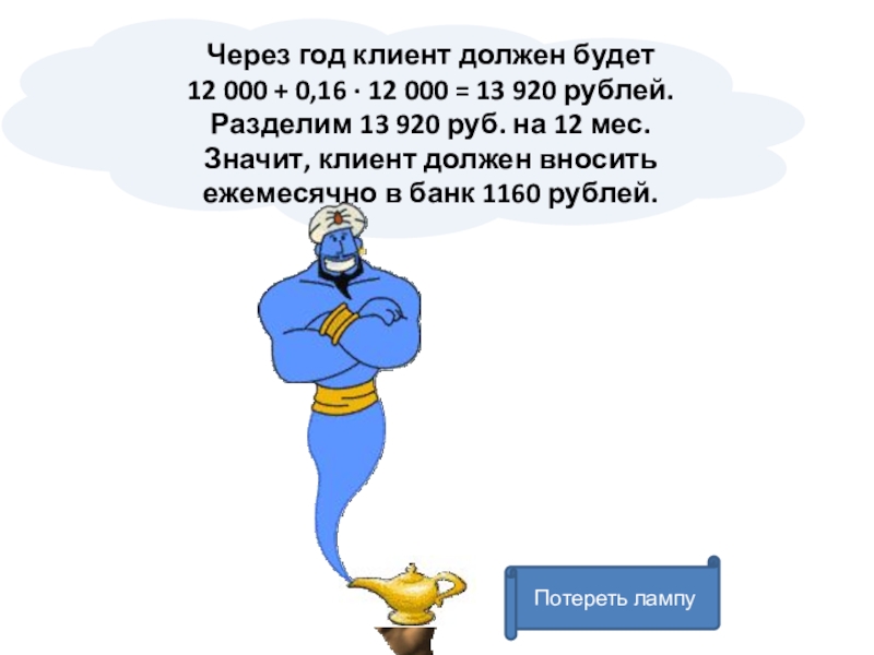 Потереть лампуЧерез год клиент должен будет 12 000 + 0,16 · 12 000 = 13 920 рублей. Разделим 13 920 руб. на 12 мес. Значит, клиент должен вносить ежемесячно в