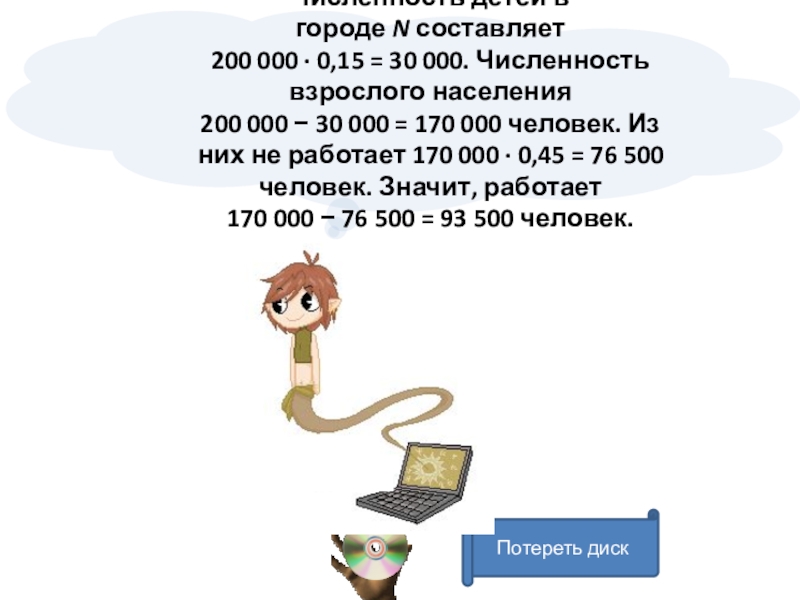 Потереть дискЧисленность детей в городе N составляет 200 000 · 0,15 = 30 000. Численность взрослого населения 200 000 − 30 000 = 170 000 человек. Из них не работает 170 000 · 0,45 = 76 500 человек.