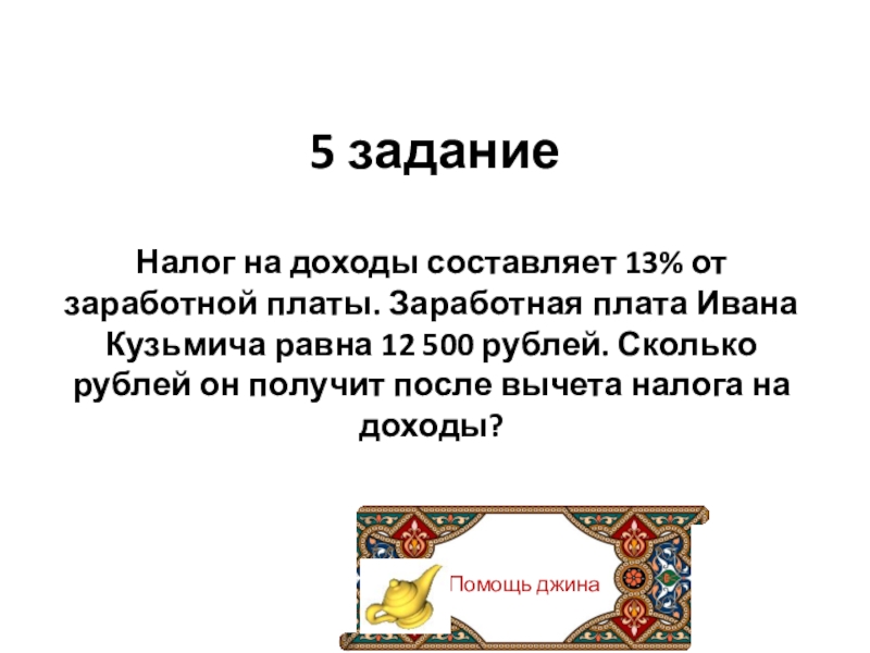 Помощь джина5 заданиеНалог на доходы составляет 13% от заработной платы. Заработная плата Ивана Кузьмича равна 12 500 рублей.
