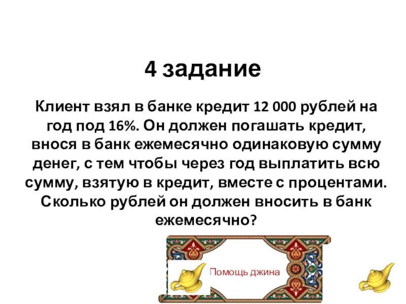 Помощь джина4 заданиеКлиент взял в банке кредит 12 000 рублей на год под 16%. Он должен погашать кредит,
