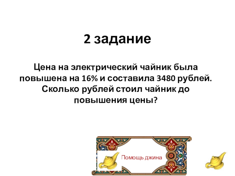 Помощь джина2 заданиеЦена на электрический чайник была повышена на 16% и составила 3480 рублей. Сколько рублей стоил