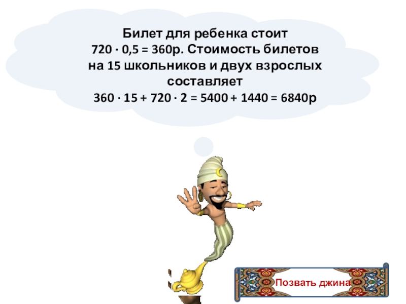 Помощь джина1 заданиеЖелезнодорожный билет для взрослого стоит 720 рублей. Стоимость билета для школьника составляет 50% от стоимости