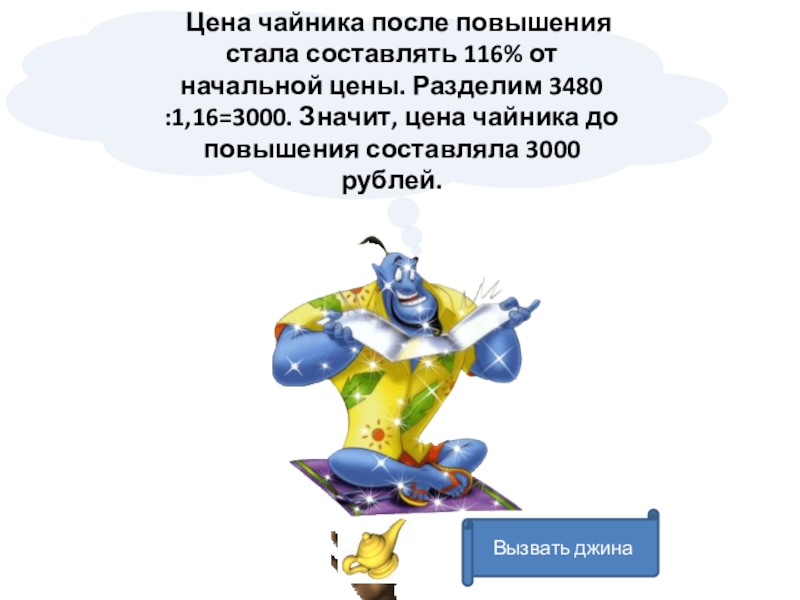 Вызвать джинаЦена чайника после повышения стала составлять 116% от начальной цены. Разделим 3480 :1,16=3000. Значит, цена чайника