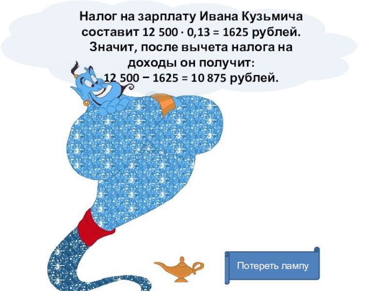 Потереть лампуНалог на зарплату Ивана Кузьмича составит 12 500 · 0,13 = 1625 рублей. Значит, после вычета налога на доходы он получит: