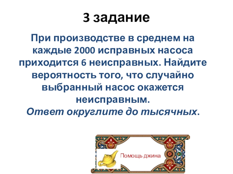 Помощь джина3 заданиеПри производстве в среднем на каждые 2000 исправных насоса приходится 6 неисправных. Найдите вероятность того,