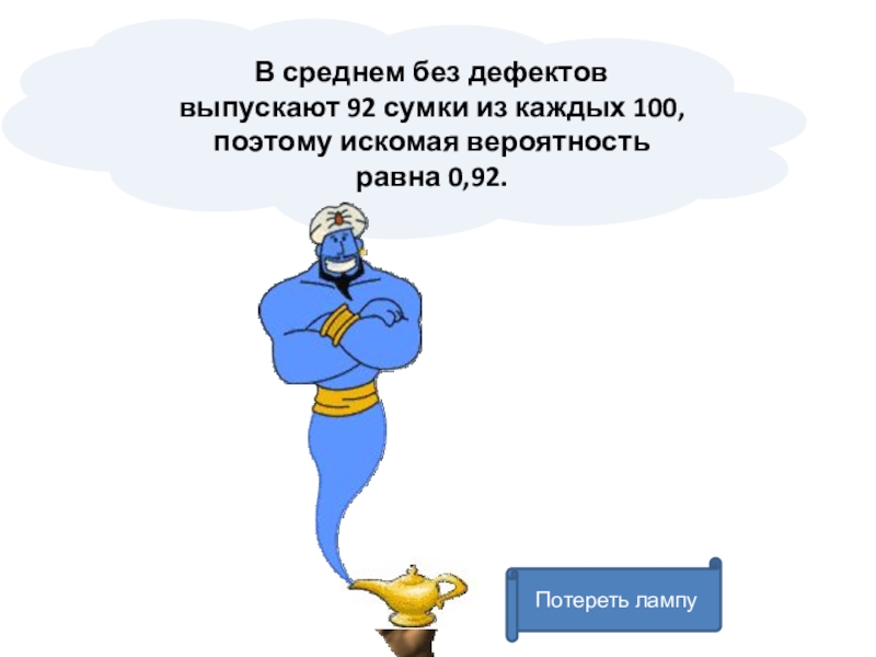 Потереть лампуВ среднем без дефектов выпускают 92 сумки из каждых 100, поэтому искомая вероятность равна 0,92.