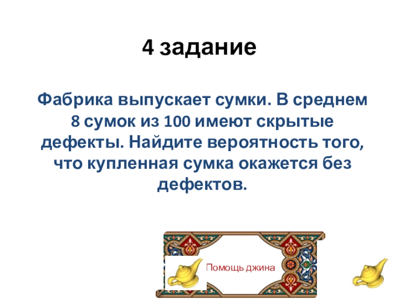 Помощь джина4 заданиеФабрика выпускает сумки. В среднем 8 сумок из 100 имеют скрытые дефекты. Найдите вероятность того,