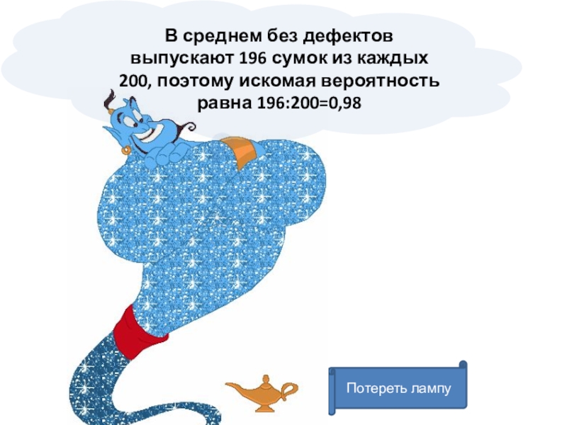 Потереть лампуВ среднем без дефектов выпускают 196 сумок из каждых 200, поэтому искомая вероятность равна 196:200=0,98