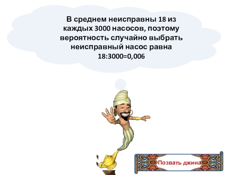 Позвать джинаВ среднем неисправны 18 из каждых 3000 насосов, поэтому вероятность случайно выбрать неисправный насос равна 18:3000=0,006