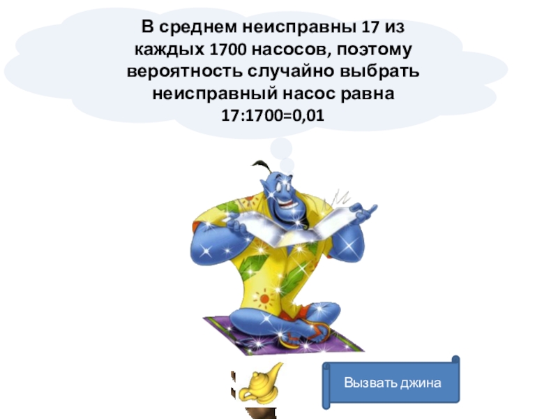 Вызвать джинаВ среднем неисправны 17 из каждых 1700 насосов, поэтому вероятность случайно выбрать неисправный насос равна 17:1700=0,01