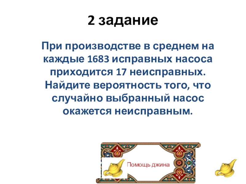 Помощь джина2 заданиеПри производстве в среднем на каждые 1683 исправных насоса приходится 17 неисправных. Найдите вероятность того,