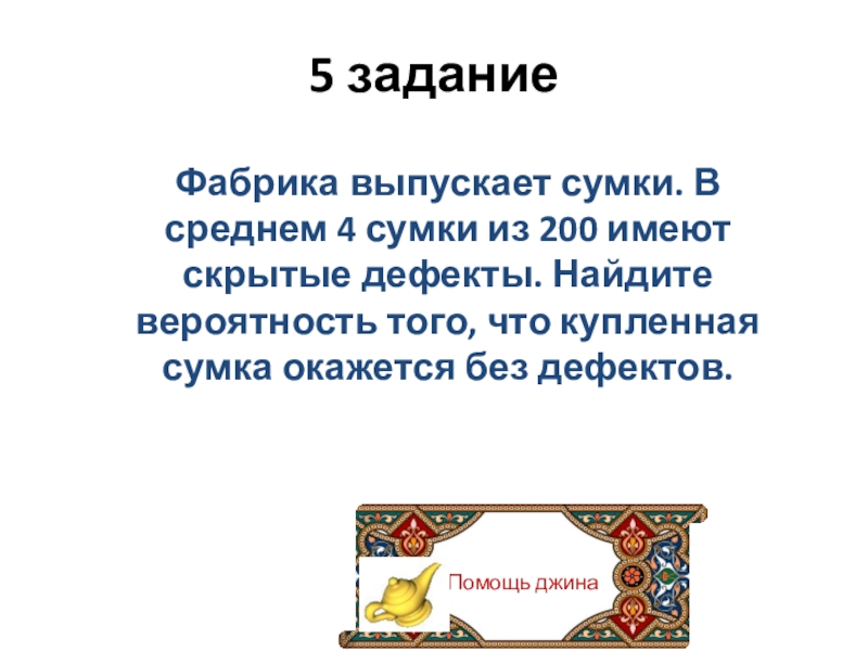 Помощь джина5 заданиеФабрика выпускает сумки. В среднем 4 сумки из 200 имеют скрытые дефекты. Найдите вероятность того,