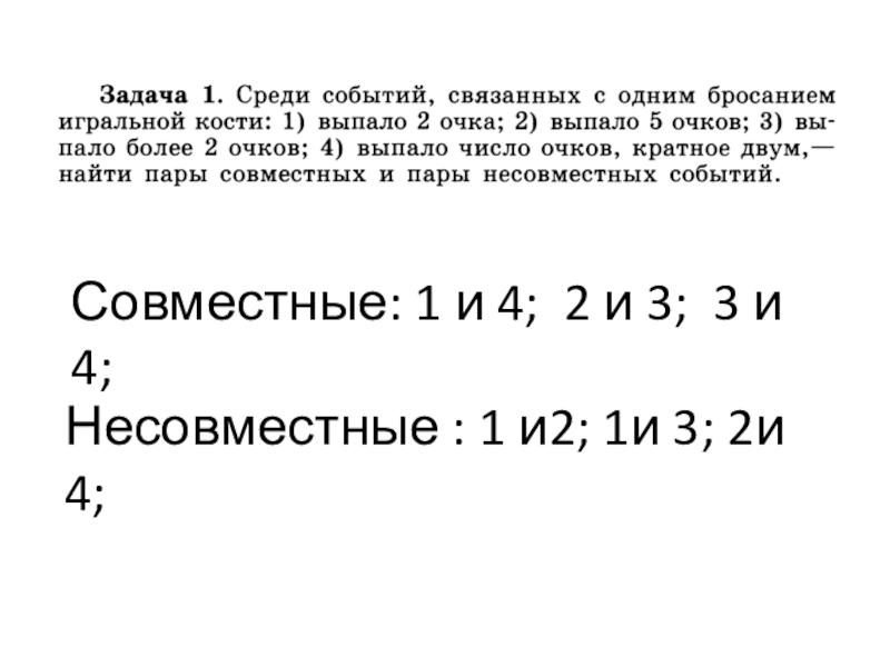 Совместные: 1 и 4; 2 и 3; 3 и 4;Несовместные : 1 и2; 1и 3; 2и 4;