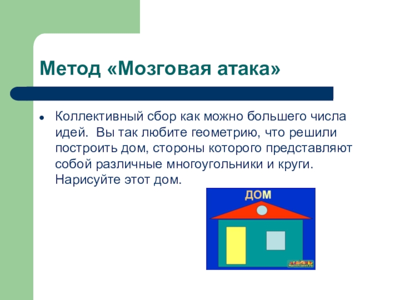 Метод «Мозговая атака»Коллективный сбор как можно большего числа идей. Вы так любите геометрию, что решили построить дом,