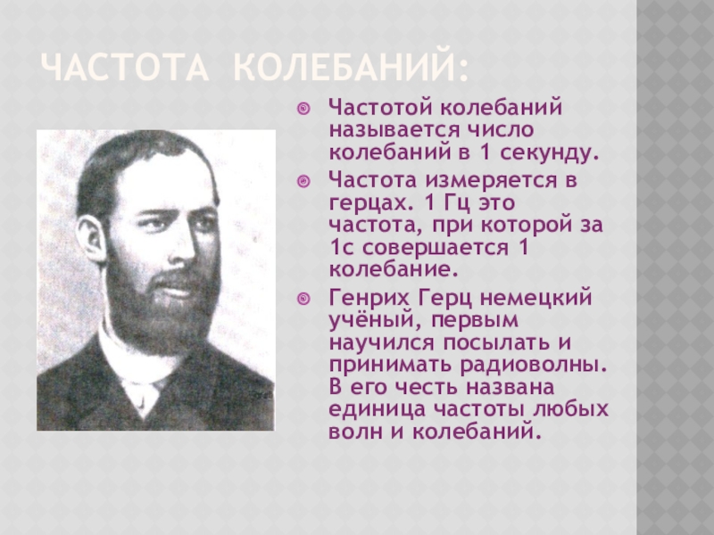 Генрих Герц немецкий учёный, первым научился посылать и принимать радиоволны. В его честь названа единица частоты любых волн и колебаний.