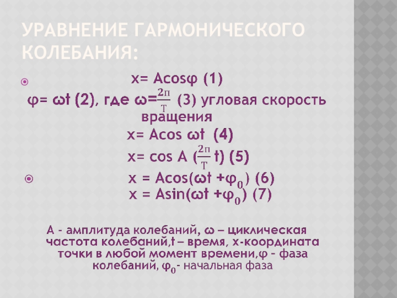 Слайд 21Уравнение гармонического колебания: