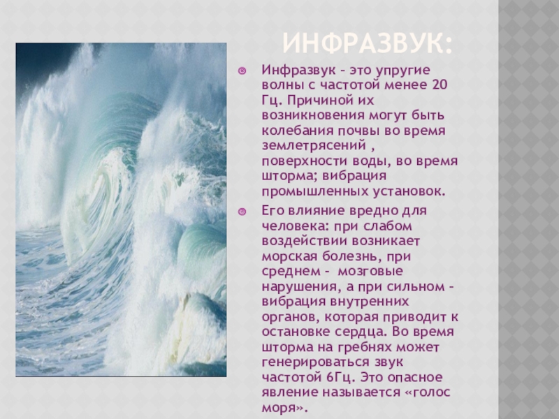 Его влияние вредно для человека: при слабом воздействии возникает морская болезнь, при среднем - мозговые нарушения, а при сильном – вибрация внутренних органов, которая приводит к остановке сердца. Во время шторма на гребнях может генерироваться звук частотой 6Гц. Это опасное явление называется «голос моря».