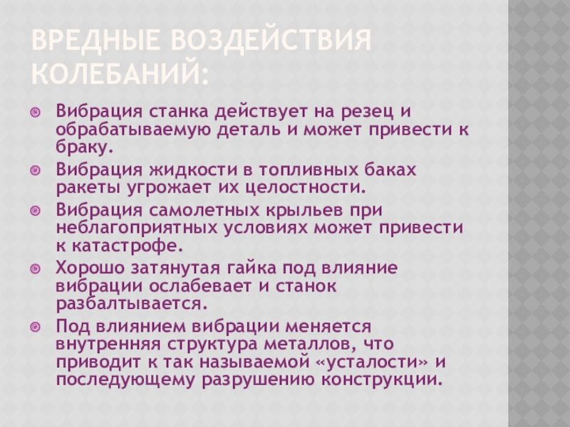 Под влиянием вибрации меняется внутренняя структура металлов, что приводит к так называемой «усталости» и последующему разрушению конструкции.