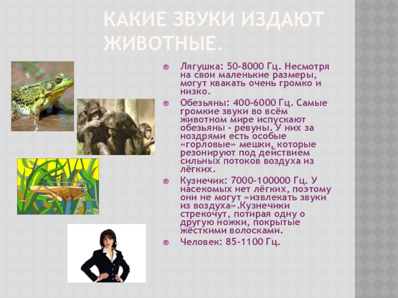 Обезьяны: 400-6000 Гц. Самые громкие звуки во всём животном мире испускают обезьяны - ревуны. У них за ноздрями есть особые «горловые» мешки, которые резонируют под действием сильных потоков воздуха из лёгких.