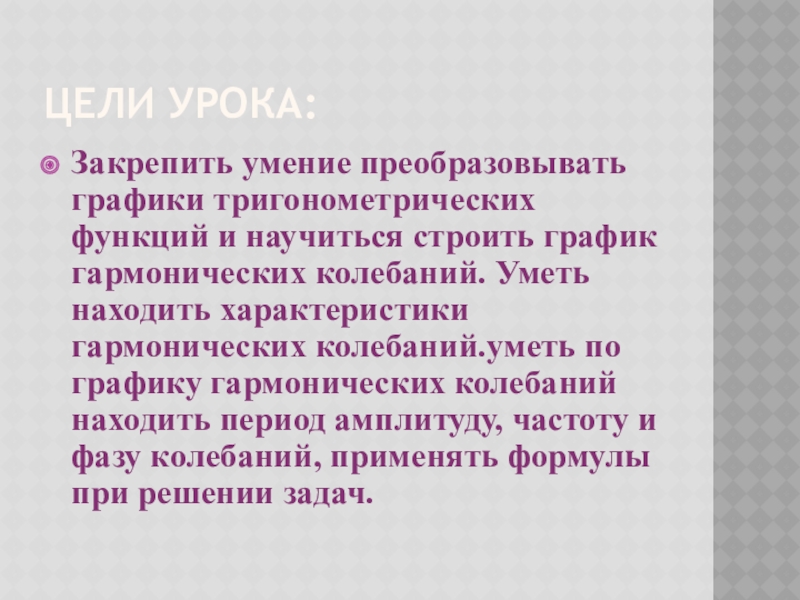 Закрепить умение преобразовывать графики тригонометрических функций и научиться строить график