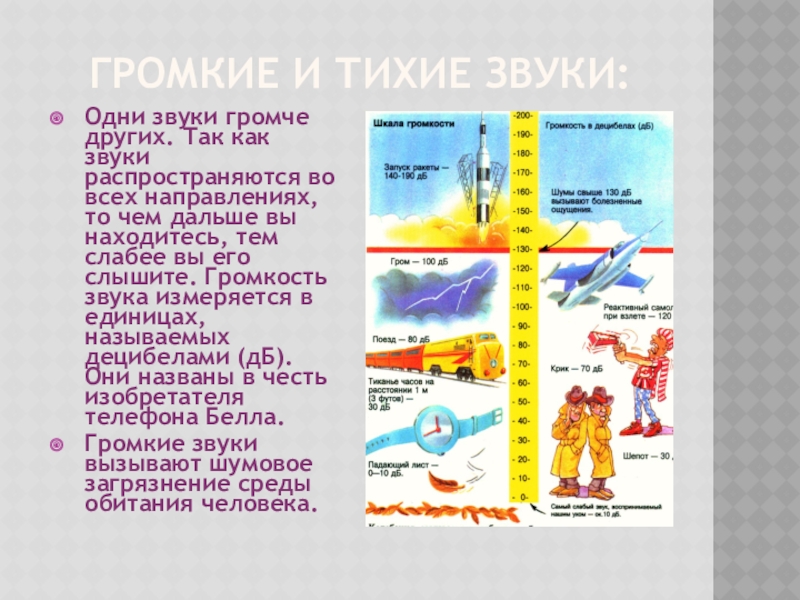 во всех направлениях, то чем дальше вы находитесь, тем слабее вы его слышите. Громкость звука измеряется в единицах, называемых децибелами (дБ). Они названы в честь изобретателя телефона Белла.