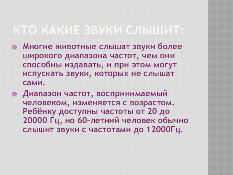 Диапазон частот, воспринимаемый человеком, изменяется с возрастом. Ребёнку доступны частоты от 20 до 20000 Гц, но 60-летний человек обычно слышит звуки с частотами до 12000Гц.