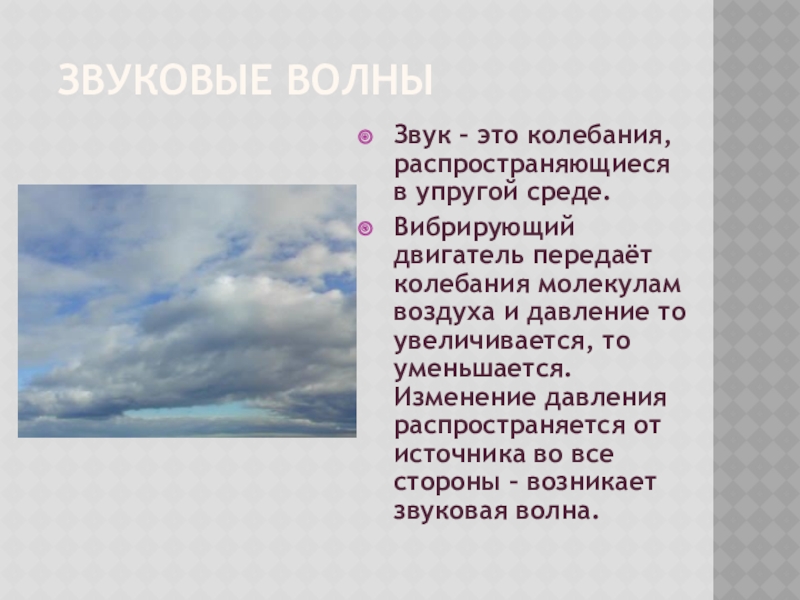 колебания молекулам воздуха и давление то увеличивается, то уменьшается. Изменение давления распространяется от источника во все стороны – возникает звуковая волна.