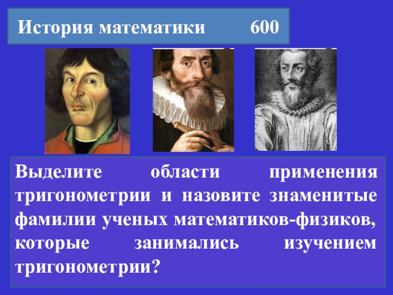 История математики     600Выделите области применения тригонометрии и назовите знаменитые фамилии ученых математиков-физиков, которые