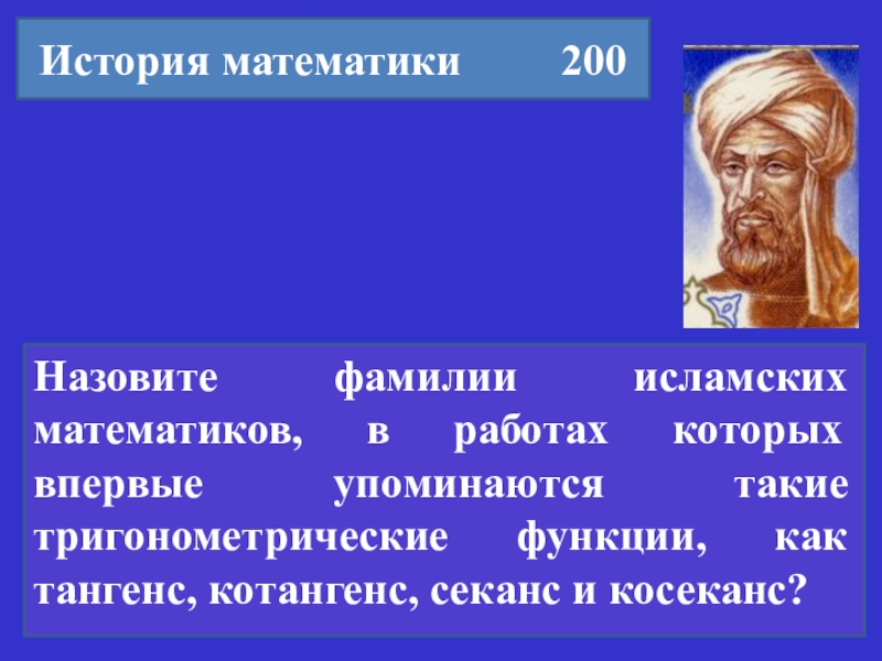 История математики     200Назовите фамилии исламских математиков, в работах которых впервые упоминаются такие тригонометрические