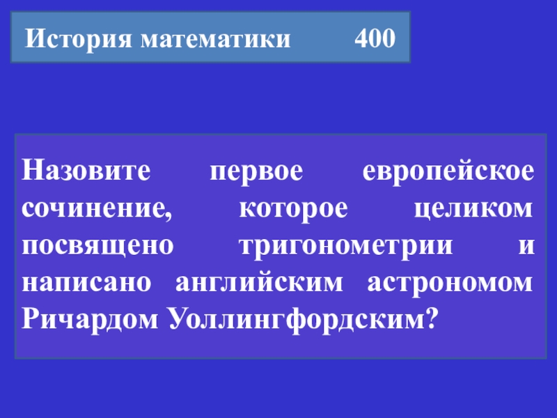 История математики     400Назовите первое европейское сочинение, которое целиком посвящено тригонометрии и написано английским