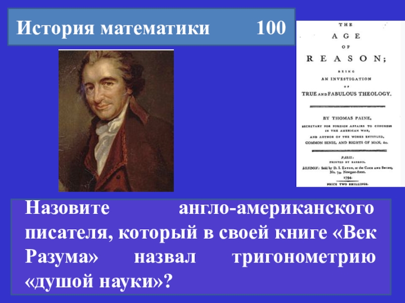 История математики     100Назовите англо-американского писателя, который в своей книге «Век Разума» назвал тригонометрию