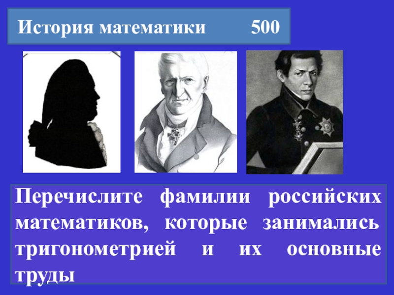 Слайд 7Перечислите фамилии российских математиков, которые занимались тригонометрией и их основные труды