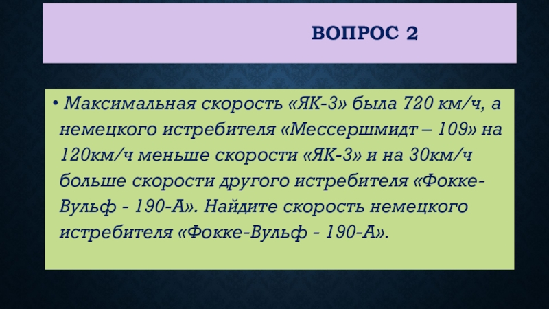 Максимальная скорость «ЯК-3» была 720 км/ч, а немецкого истребителя «Мессершмидт – 109» на 120км/ч меньше скорости «ЯК-3» и на 30км/ч больше скорости другого истребителя «Фокке-Вульф - 190-А». Найдите скорость немецкого истребителя «Фокке-Вульф - 190-А».