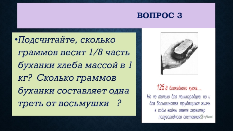 Подсчитайте, сколько граммов весит 1/8 часть буханки хлеба массой в 1 кг? Сколько граммов буханки составляет одна треть от восьмушки ?