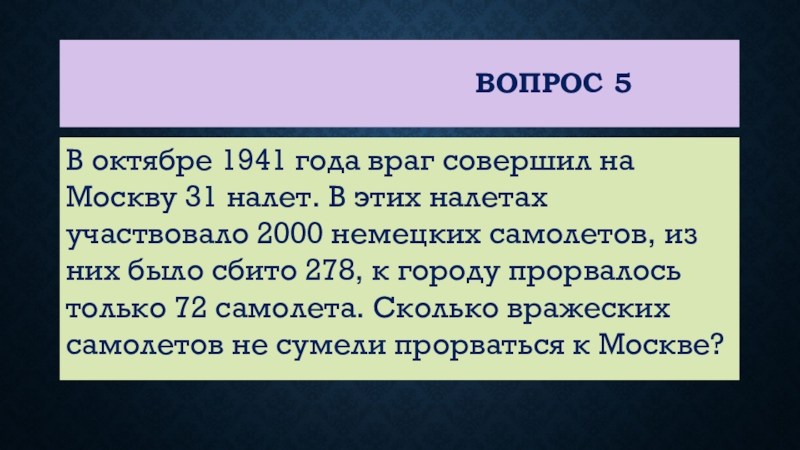 В октябре 1941 года враг совершил на Москву 31 налет. В этих налетах участвовало 2000 немецких самолетов, из них было сбито 278, к городу прорвалось только 72 самолета. Сколько вражеских самолетов не сумели прорваться к Москве?
