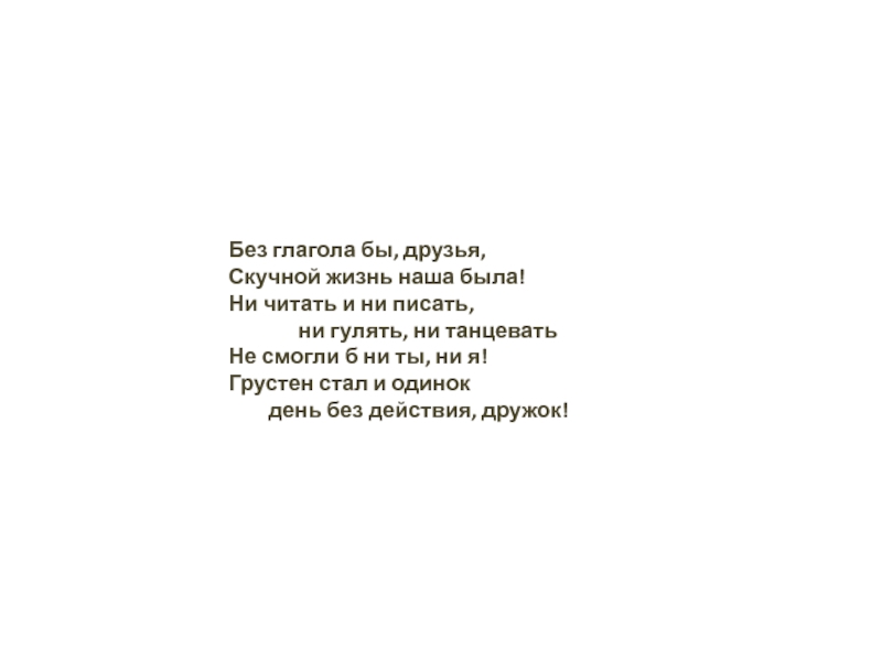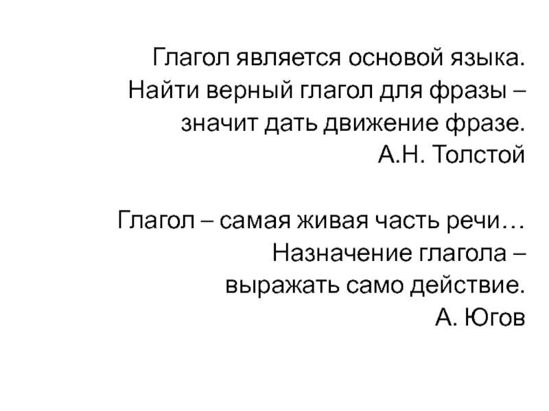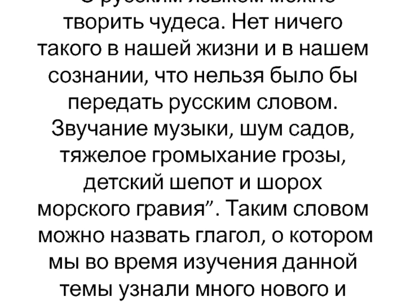 “С русским языком можно творить чудеса. Нет ничего такого в нашей жизни и в нашем сознании, что нельзя было бы передать русским словом. Звучание музыки, шум садов, тяжелое громыхание грозы, детский шепот и шорох морского гравия”. Таким словом можно назвать глагол, о котором мы во время изучения данной темы узнали много нового и интересного.