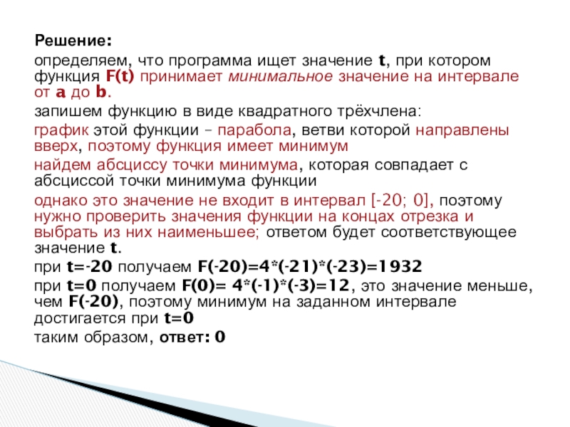 Решение:определяем, что программа ищет значение t, при котором функция F(t) принимает минимальное значение на интервале от a