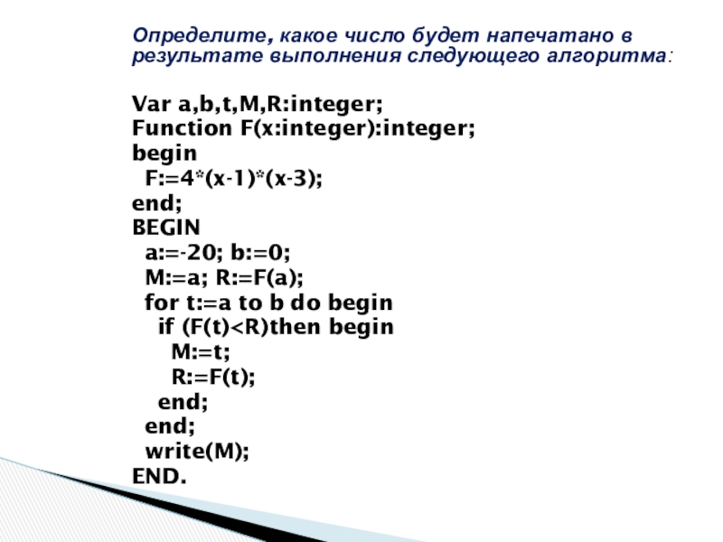 Определите, какое число будет напечатано в результате выполнения следующего алгоритма: Var a,b,t,M,R:integer;Function F(x:integer):integer;begin F:=4*(x-1)*(x-3);end;BEGIN a:=-20; b:=0; M:=a;