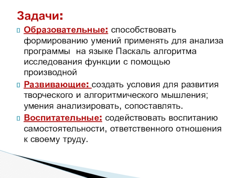 Задачи:Образовательные: способствовать формированию умений применять для анализа программы на языке Паскаль алгоритма исследования функции с помощью производной