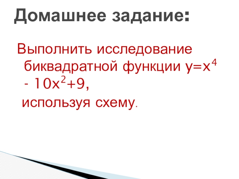 Выполнить исследование биквадратной функции y=x4 - 10x2+9, используя схему.Домашнее задание: