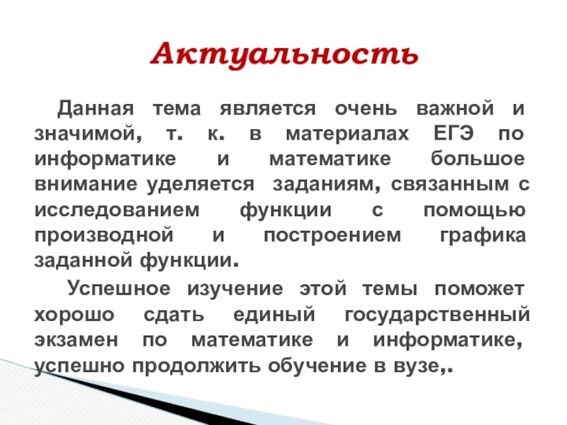 Успешное изучение этой темы поможет хорошо сдать единый государственный экзамен по математике и информатике, успешно продолжить обучение в вузе,.